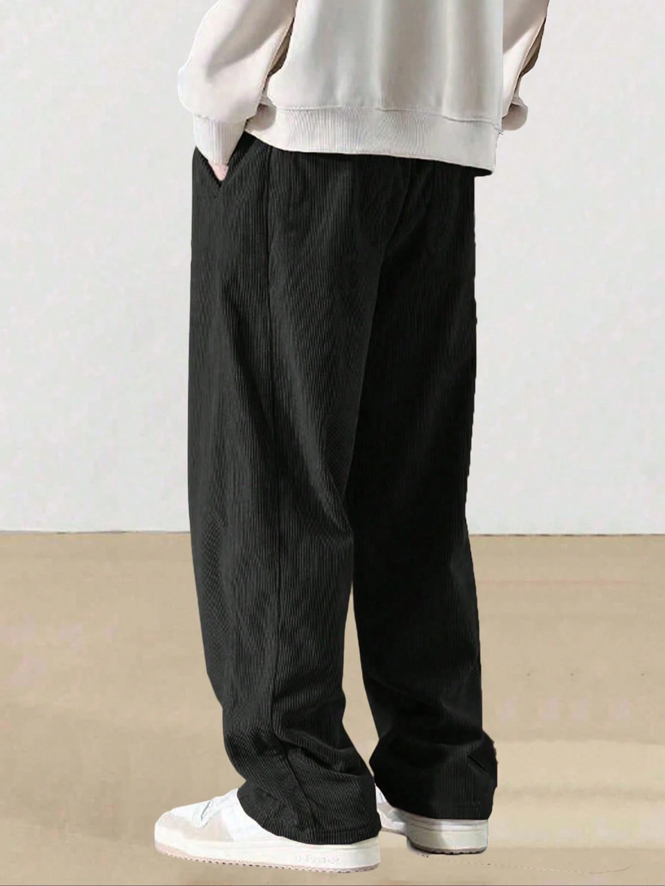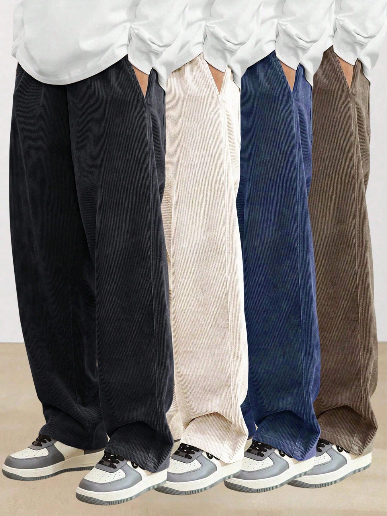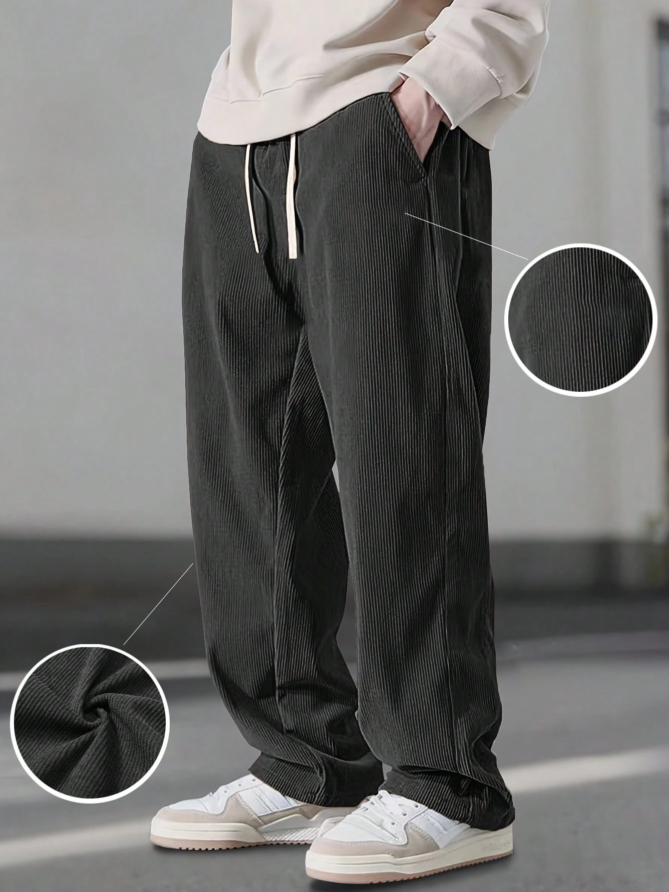 1 db-os férfi kordbársony húzózsinóros derékú, széles szárú, divatos, hétköznapi sportnadrág, amely alkalmas szabadtéri sportokhoz.