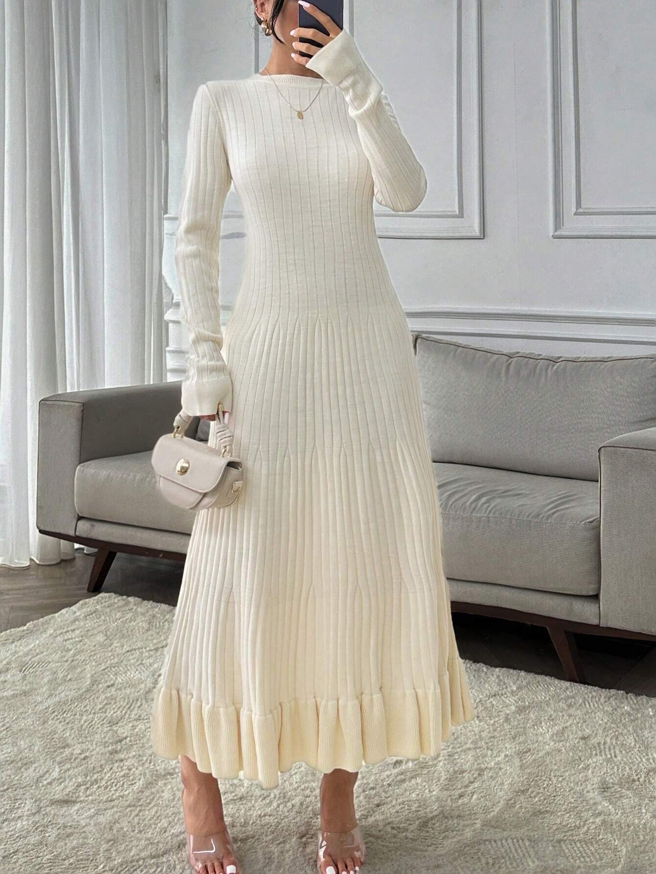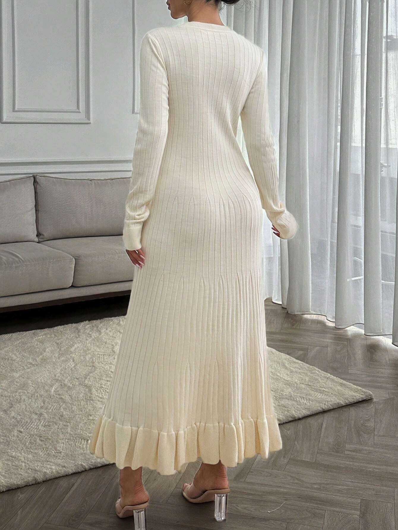 Elegáns tombolasorsolási részlet a szegélyen, bordás nyakú, kötött maxi pulóverruhán