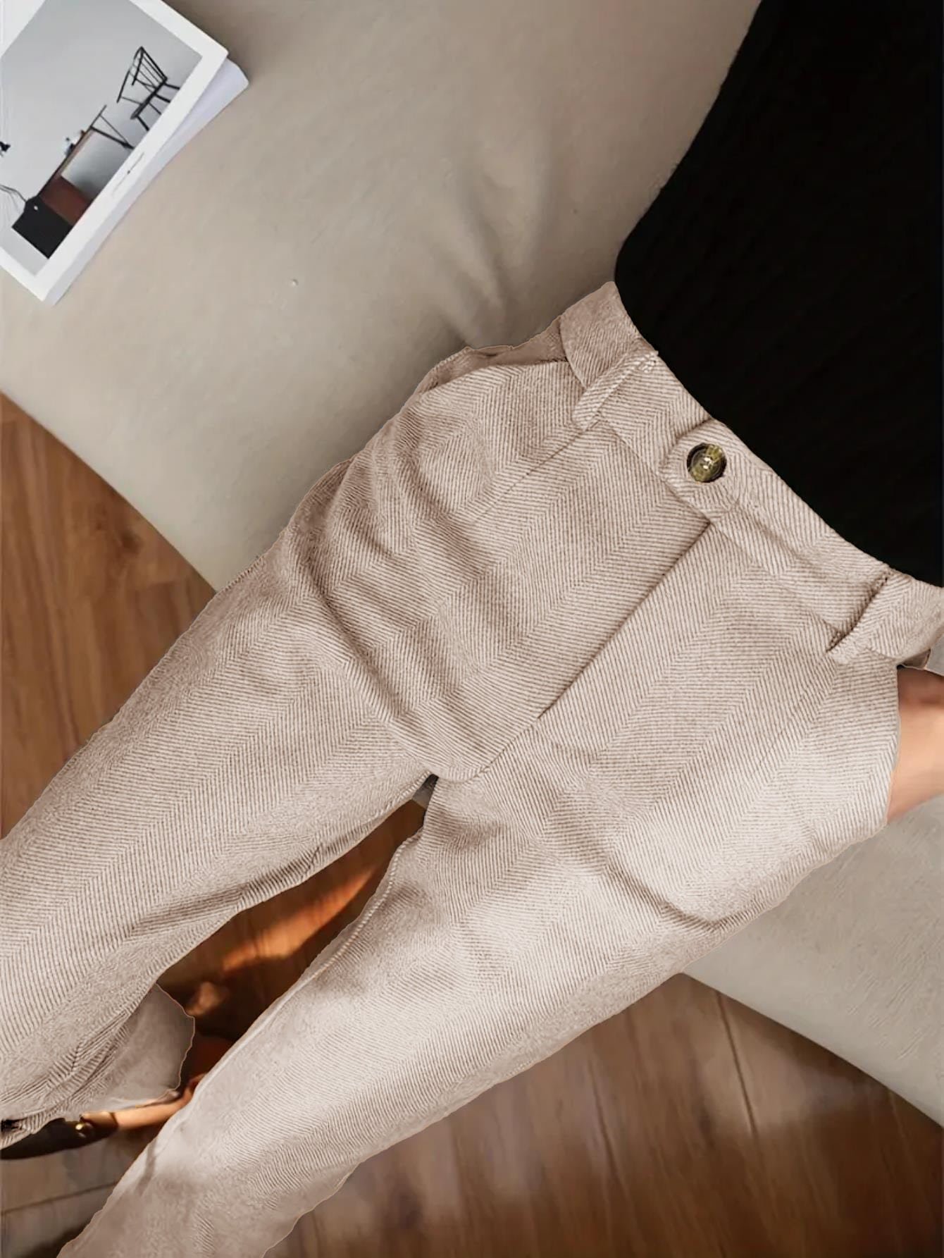 Francia dizájnú, niche stílusú, egyenes szárú, magas derekú öltönynadrág