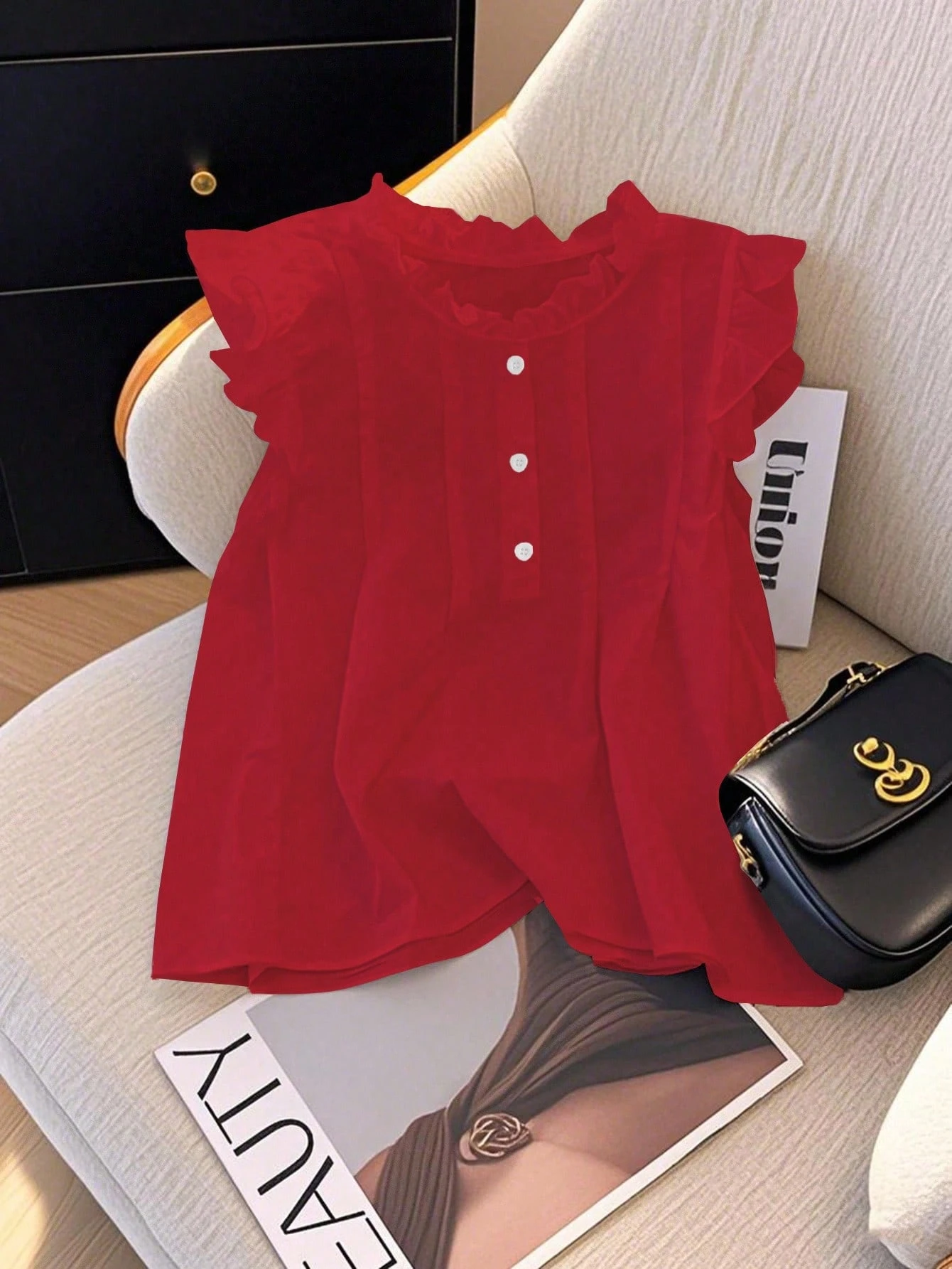 Franclia Női lezser, egyszínű, kerek nyakú, fodros, gombos blúz, nyári
