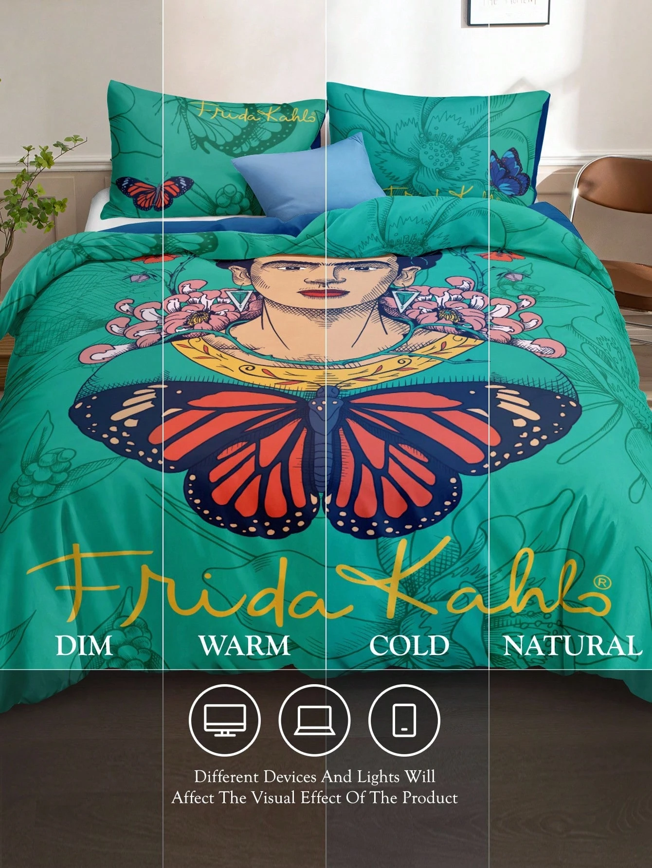 Frida Kahlo X SHEIN 3 darabos zöld virágmintás és pillangómintás ágyneműhuzat-szett, puha, lélegző, meleg anyagból, különböző ágyméretekhez illik, hálószoba dekorációhoz