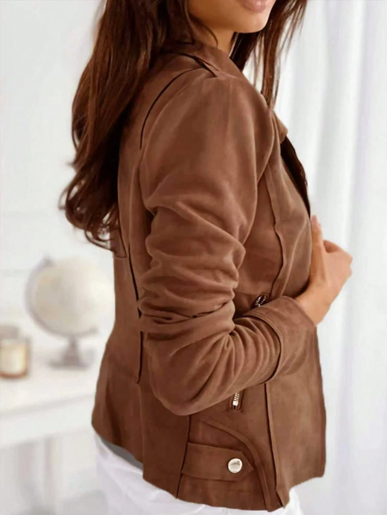 Női cipzáras, gombos díszítésű, lezser, testhezálló, rövid állú gallérú, cipzáras, művelúr rövid kabát
