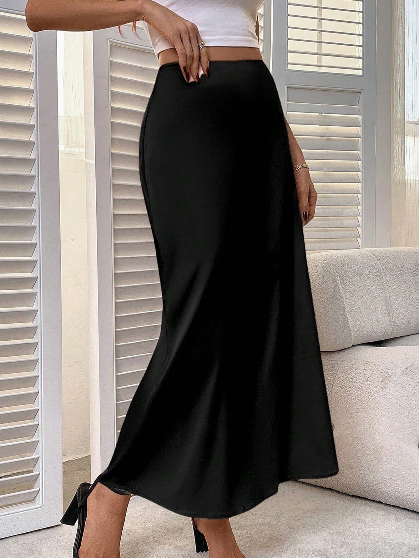 Női egyszínű elegáns cipzáras hasított szoknya, enyhén rugalmas szatén anyag, elegáns minimalista divat nyárra alkalmas