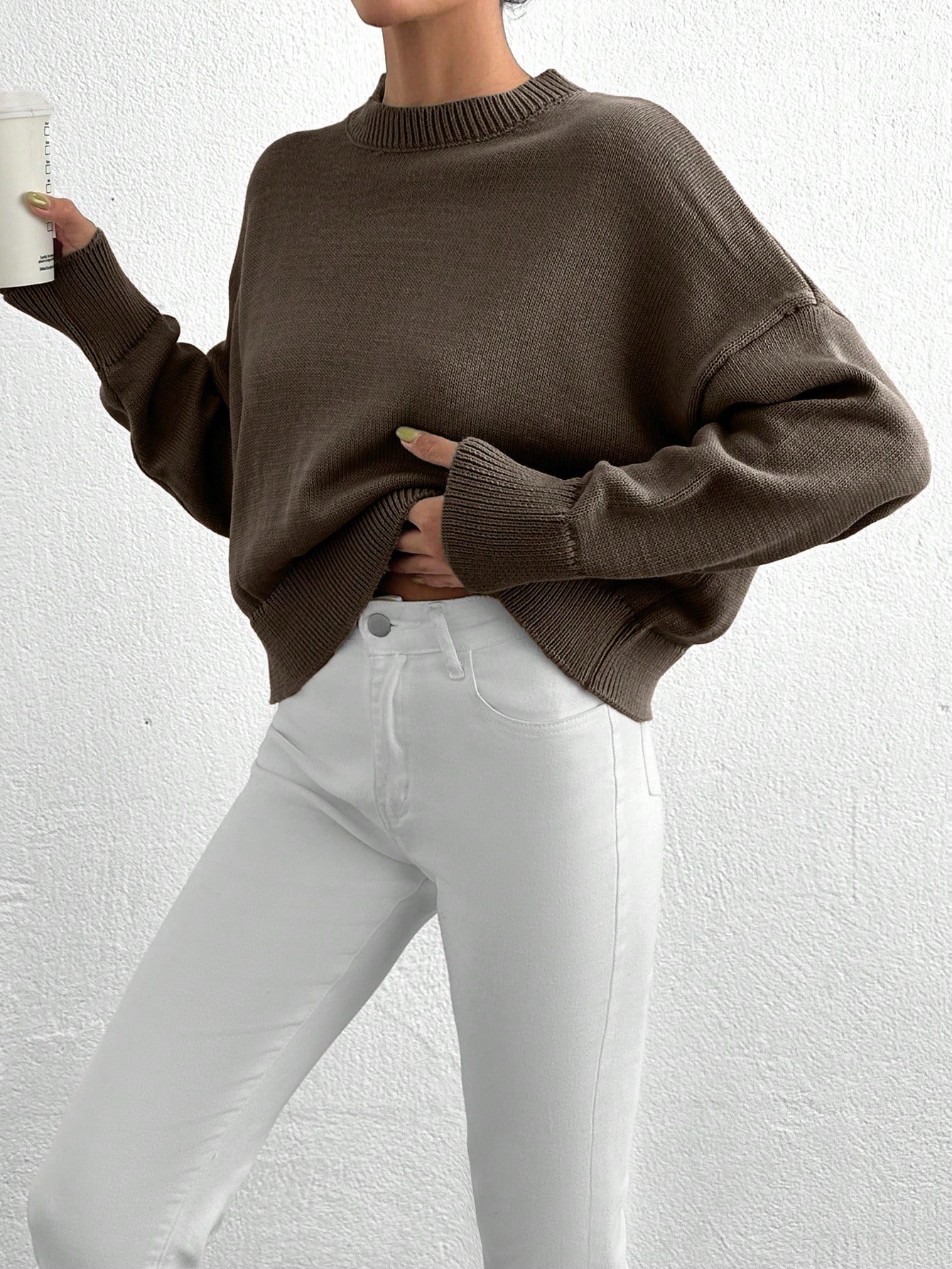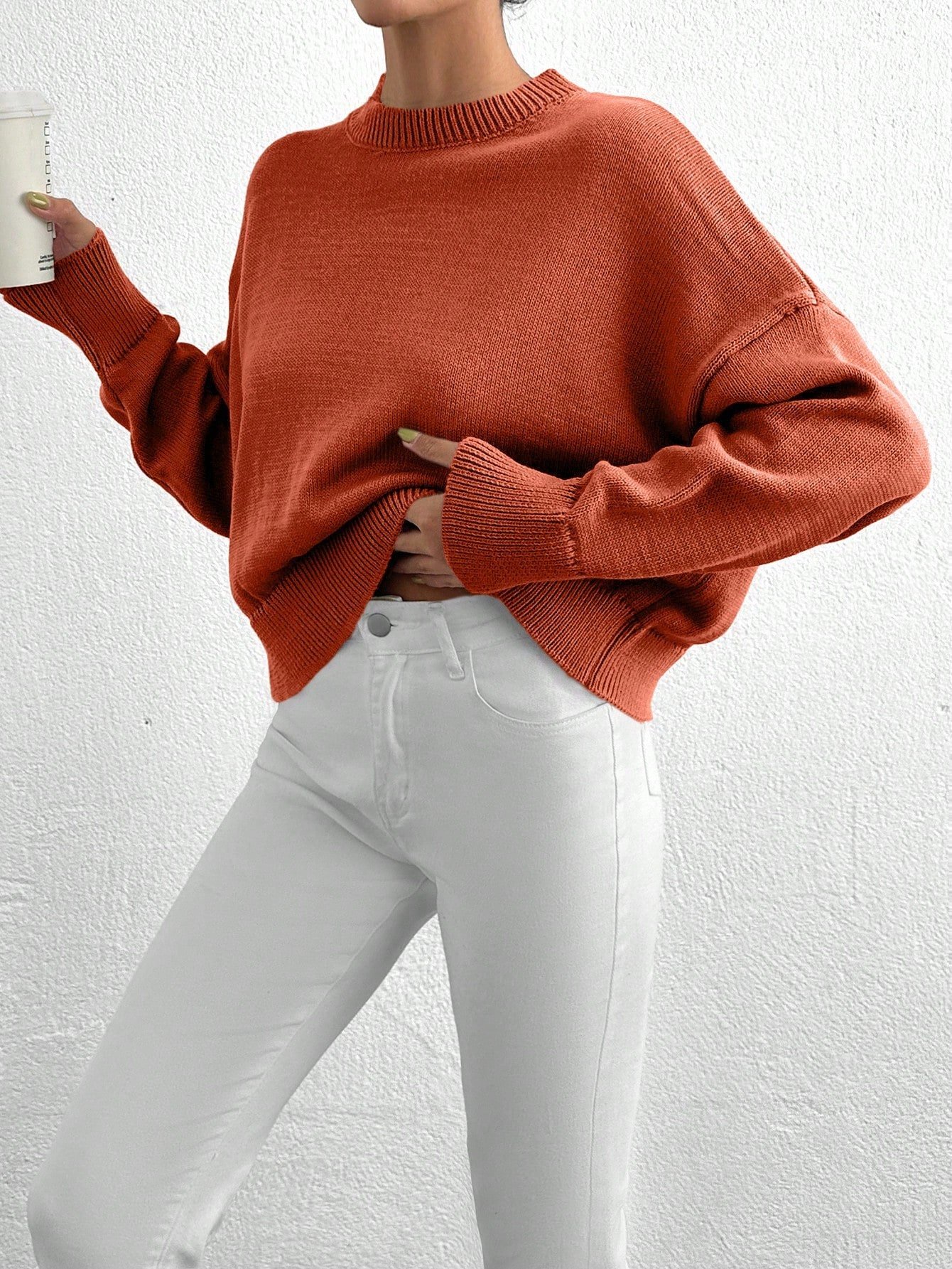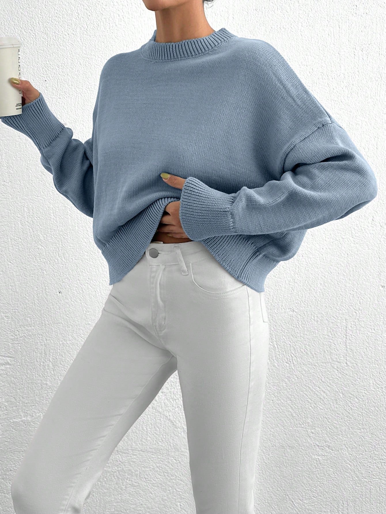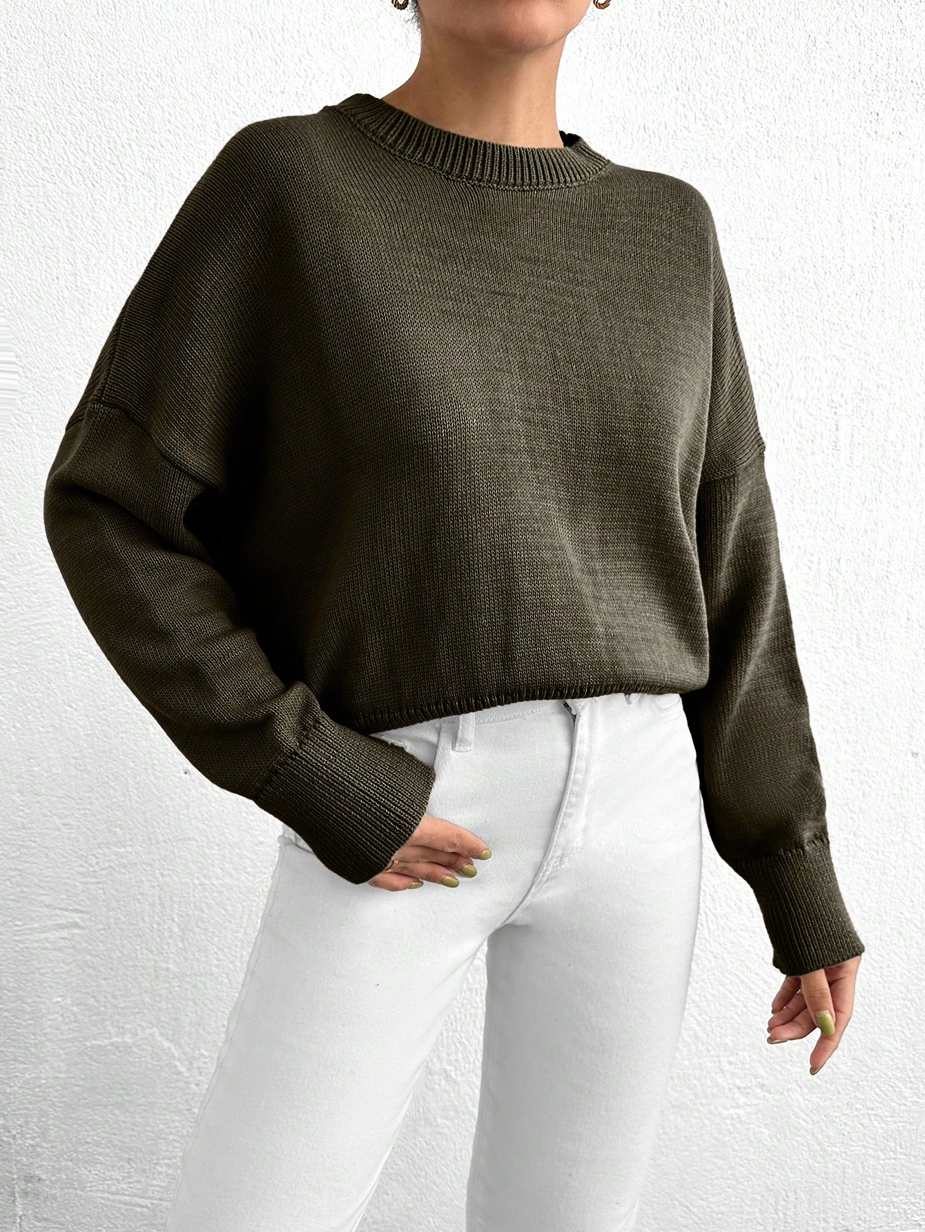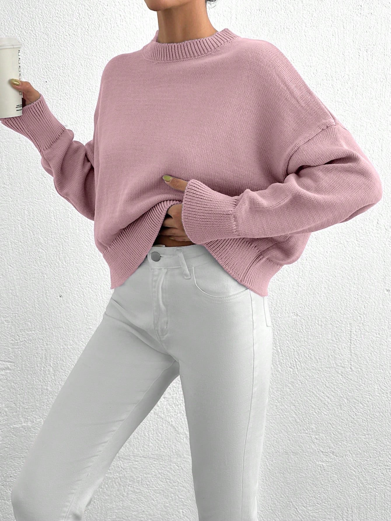 Női egyszínű, vállpántos, hosszú ujjú, kerek nyakú, lezser, túlméretezett pulóver