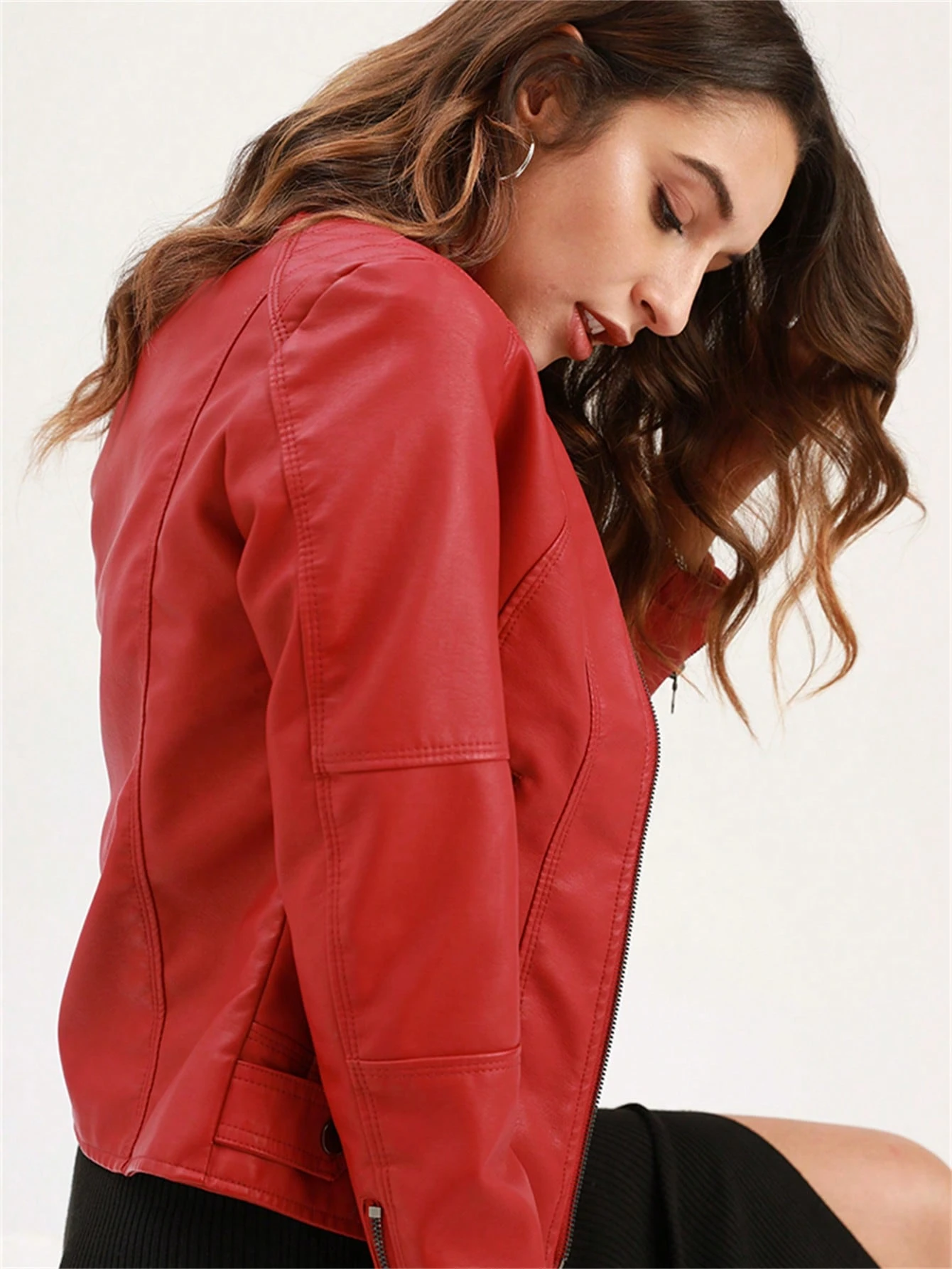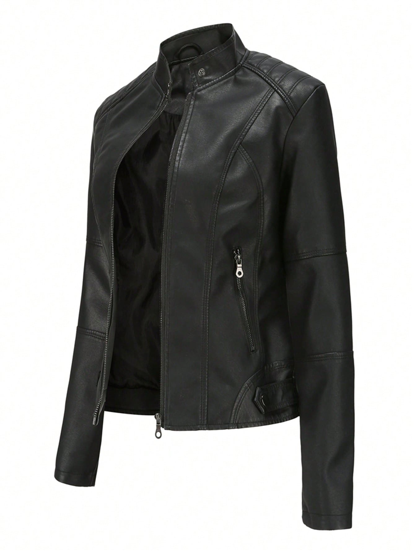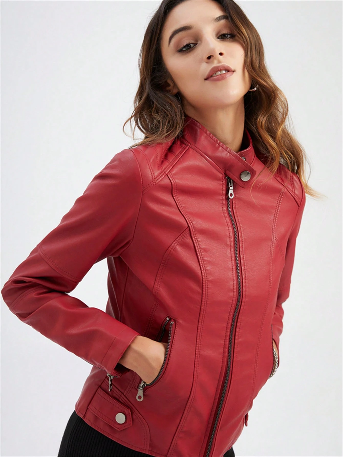 Női karcsúsított bőrdzseki, vékony tavaszi és őszi motoros kabát, női műbőr állógalléros dzseki