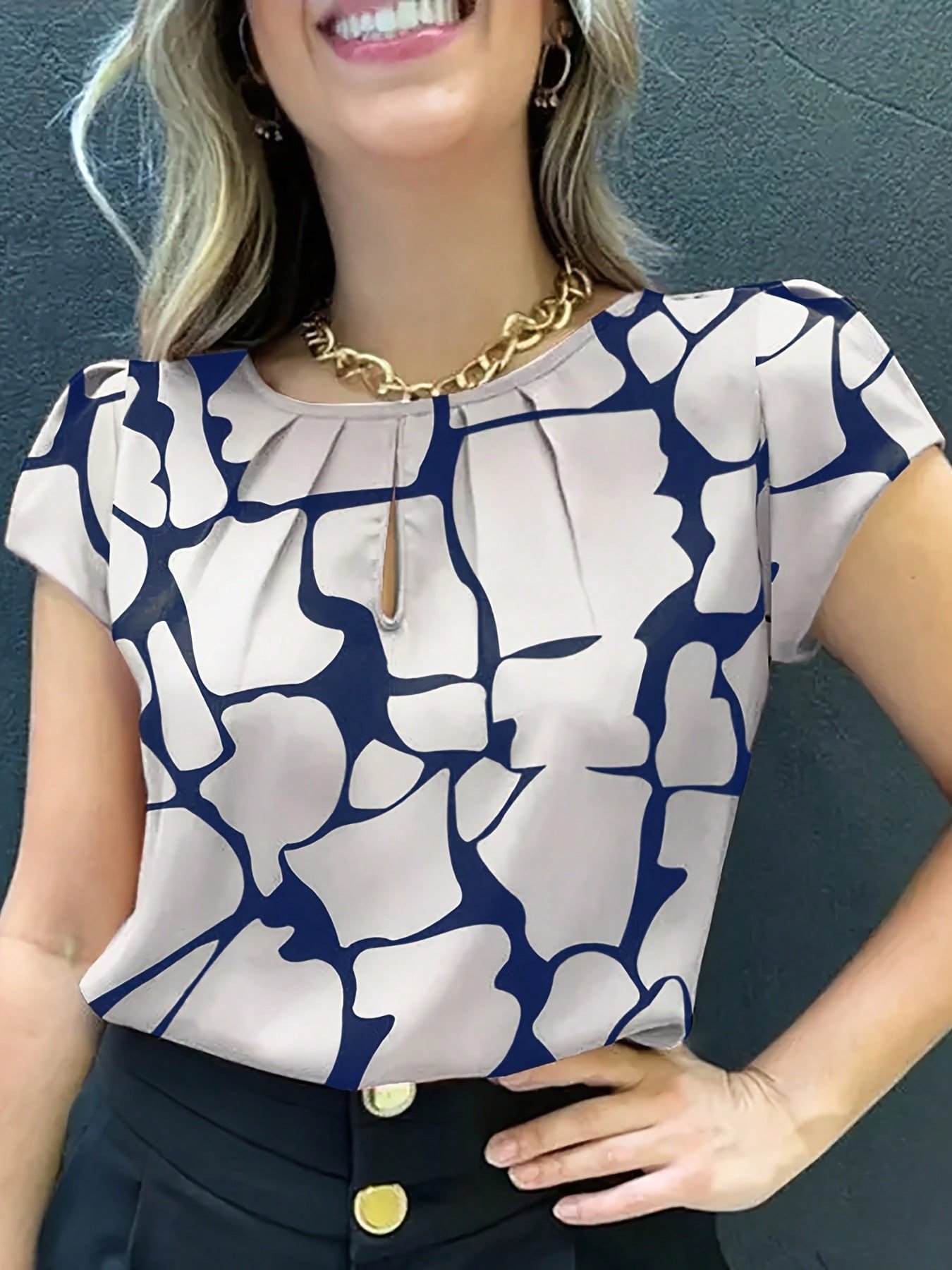 Női lezser mintás felső, kerek nyakú, rövid ujjú, bő szabású, rakott mellkasi részletekkel, alkalmas hétvégi szabadidős viseletre, nyárra