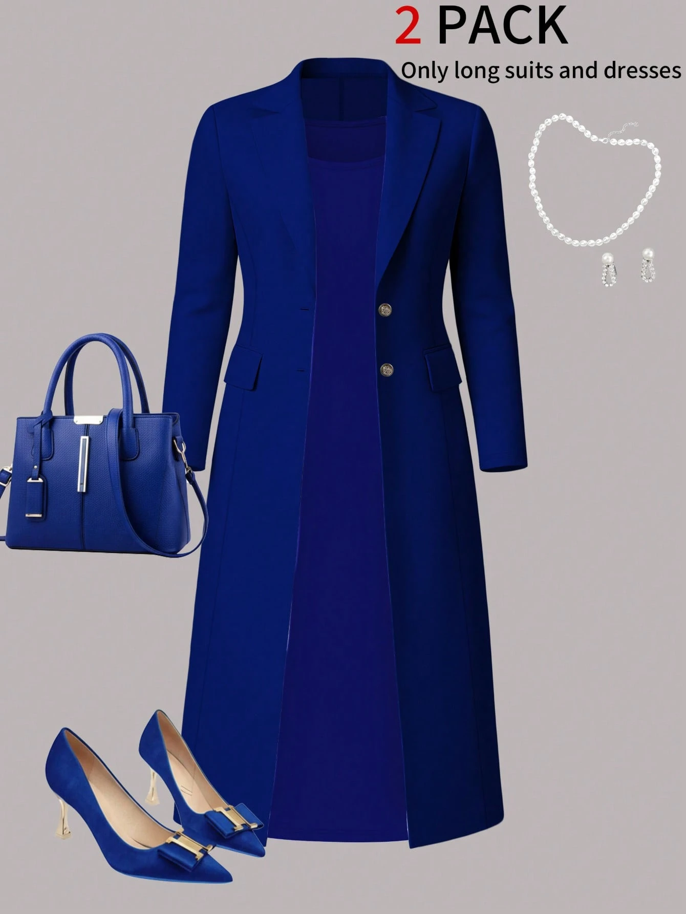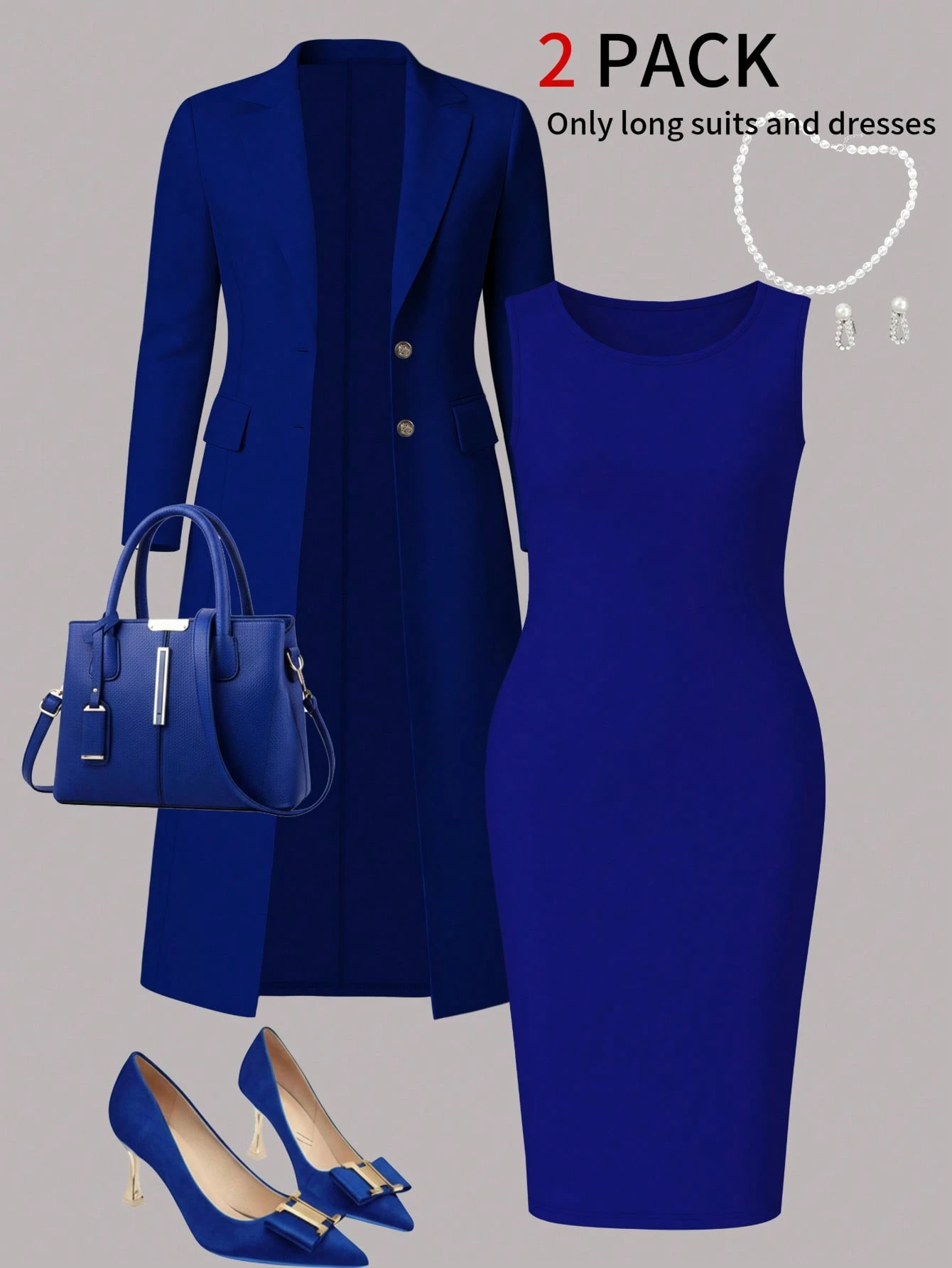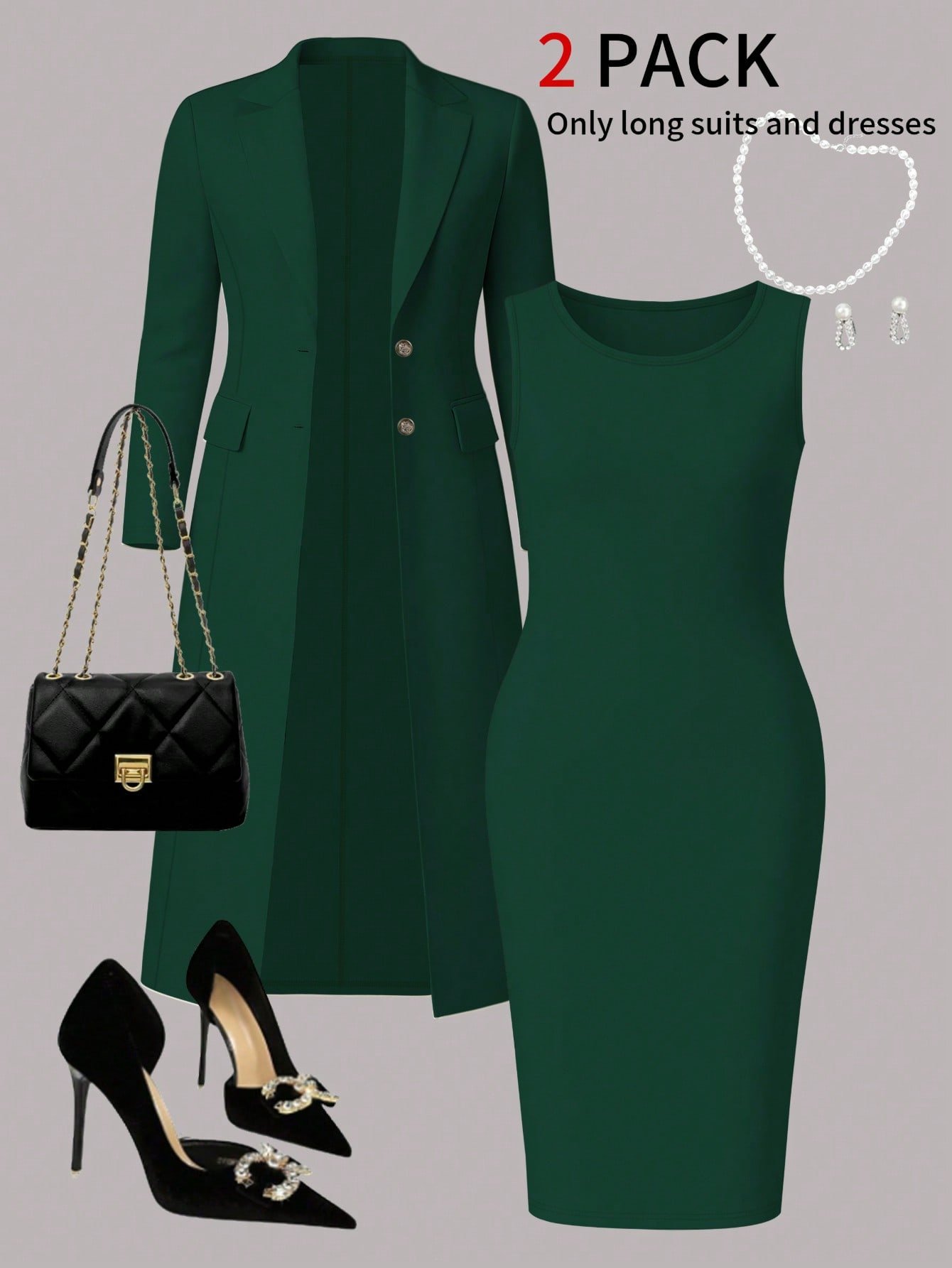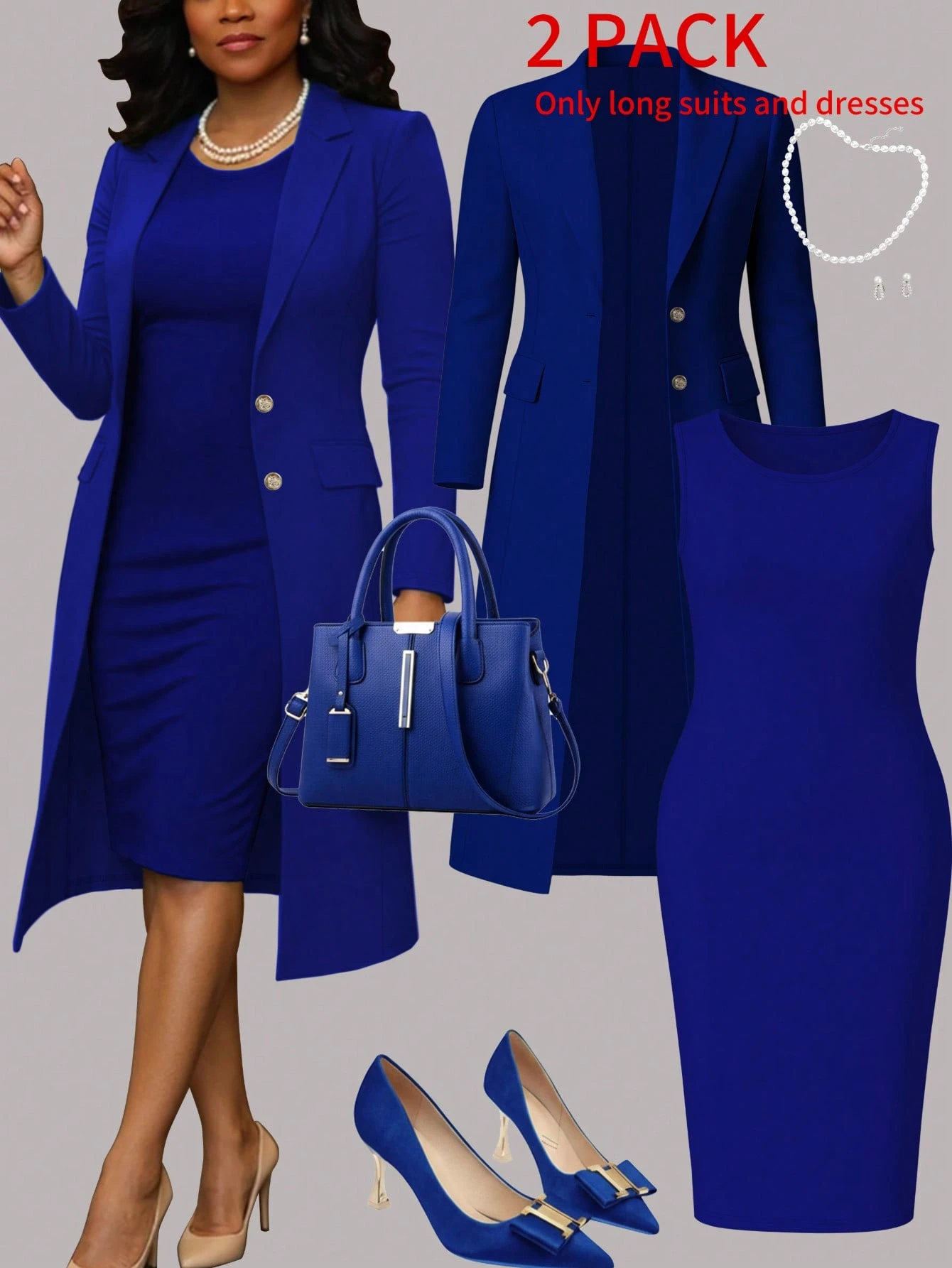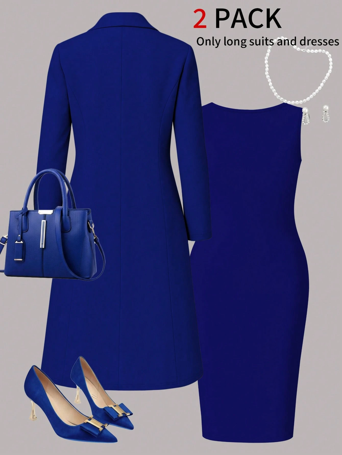 Plus Size Női Elegáns Kétrészes Szett, Egyszínű Minimalista Sokoldalú Hosszú Blézer Kardigán + Bodycon Közepes Hosszú Ruha, Alkalmas Mindennapi Ingázásra, Ősz/Tél