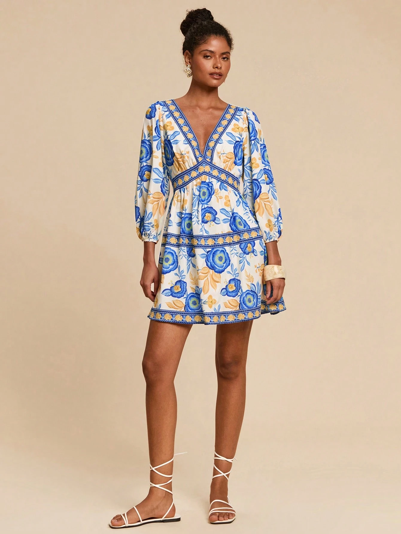 Travachic Női V-nyakú, 3/4 ujjú, mini mintás, szőtt ruha, nyári női ruhák, strandruha, tavaszi és nyári, húsvéti, ünnepi ruhák, női strandruhák, tavaszi szünet, nyaralási ruhák, női koncertruhák, bohém stílus, zenei fesztiválok, július 4-i ruhák, trópusi
