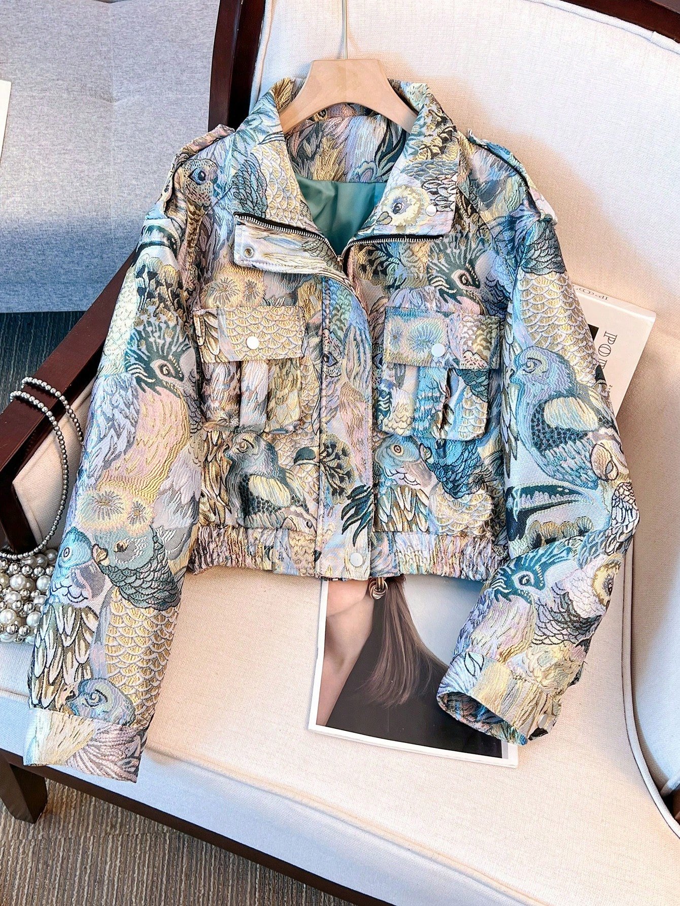 Vintage hímzett jacquard motoros dzseki, utcai hangulat, elülső cipzáras zsebek